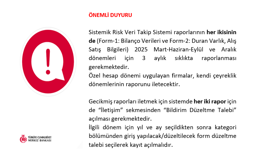 Sistem kapsamında bildirimle yükümlü olan firmalar, finansal raporlama çerçevesine uygun olarak hazırlanan verileri, Sistemik Risk Veri Takip Sistemi Veri Formunu kullanmak suretiyle üç aylık hesap dönemleri itibarıyla Rapor Girişi bölümünden giriş yaparak müteakip ayın son gününe kadar bildireceklerdir.
